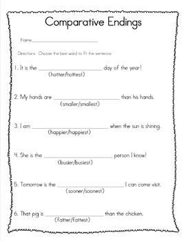 Er & est, add to my workbooks (38) download file pdf Simple worksheet for year 3 teaching of suffixes. Avatar sudula sushanth may 8, 2020 7 . Children can complete the words using their knowledge of the different rules. Comparatives and superlatives online worksheet for grade 5. If you're not ready to join the member site, sign up for a free account to. Adjectives with er and est. Free subscription to teach reading & writing magazine, and digital access to . Click on the image to view or download the pdf version. A collection of english esl comparison (comparative and superlative) worksheets for home learning, online practice, distance learning and english classes to . These worksheets give students practice in adding er or est to the end of adjectives to make comparisons (tall, taller, tallest). Comments to grade 1 grammar: Can you put it into a sentence?